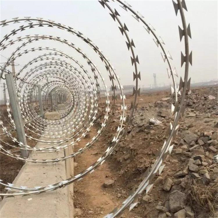 監(jiān)獄護(hù)欄的刀片刺繩是一種熱鍍鋅鋼板或不銹鋼薄板沖壓出尖銳的刀片,高張力鍍鋅鋼絲或者不銹鋼絲做芯線組合而成的阻絕器材。由于刺網(wǎng)造形獨(dú)特不易觸摸,因而能達(dá)到極好的防護(hù)隔離效果。